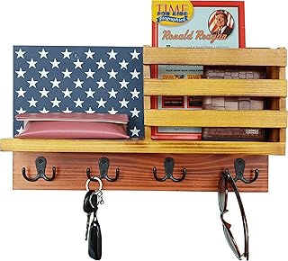 アメリカ国旗 キーホルダー & オーガナイザー 棚付き 天然モミ材製 愛国心 赤 白 青でハンドペイント ユニークなデザイン 玄関 オフィス リビングルーム 寝室の装飾アクセント