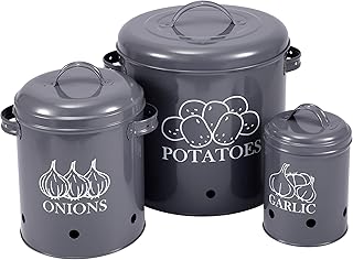 Xbopetda 食品保存容器 ポテト 玉ねぎ ニンニク用 キャニスターセット キッチンカウンター用 丸型野菜保存ポット キッチンストレージジャー エアレーション缶収納穴&蓋付き グレー