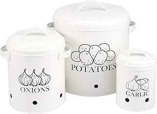 Xbopetda 食品保存容器 ポテト 玉ねぎ ニンニク用 キャニスターセット キッチンカウンター用 丸型野菜保存ポット キッチンストレージジャー エアレーション缶収納穴&蓋付き ホワイト